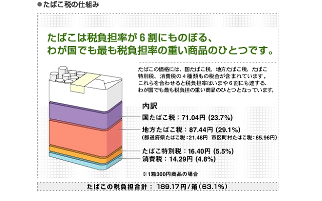 ここでもう一度、消費税に目を向けていこう。JTのホームページから、たばこ税の仕組みの、図を取ってきた。上記、図6である。たばこ税をすべて足した金額が174.88円、これを消費税4.8%で掛けてみた。答えは8.39円と出た。これがたばこ税に消費税を払っている、金額だったことになる。これが二重課税の実態だ。 生活に密着している消費税を、改めて見てみると、いかに悪税かが見えてくる。商品価格が上がっても、たばこ税やガソリン税のような間接税が上がっても、消費税は上がる仕組みになっている。本当によく考えてある悪税だ。 |