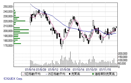 上記、図11を見てみよう。これは、りそなHDの日足チャートでの2007年8月16日から2007年11月29日値動きだ。図9の日経平均ほど、大きく値上がりしていないように見える。ところが、ここで知ってほしいことがある。日経平均とは「日経平均株価225種」というのが正式名称。日経とは、もちろん日本経済新聞社のこと。日本経済新聞社が、日本国内最優良企業の225社を、アメリカのダウジョーズ社の、ダウ式計算法(下に示す)にて算出されている。さてこの、りそなHDだが関東地方の地方銀行になる。地方銀行でも日経225種に含まれる。つまりこの図11の金額は図9の日経平均株価に影響しているのである。