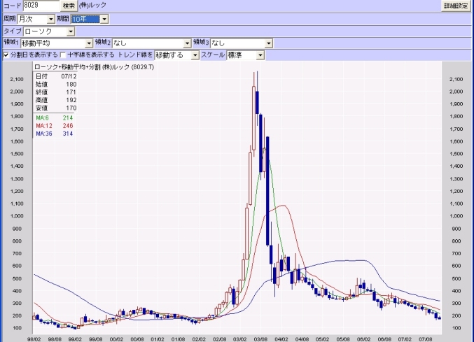 私が株式を始めた頃、上場企業でも倒産する時代というか、政治的政策が馬鹿だったのかは、わからないが会社は潰れていった。日経平均は、8千円前後のところを動いていた。こんな時に、やはり最高値2160円をつけたルックは、200円前後から、10倍まで高値をつけていったことになる。