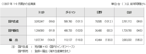 選挙があるから、「増税の話はしない」ではなく、増税派、経済成長派は、主張をはっきりさせてもらいたい。外国人投資家は、日本が増税すれば、株式を買うことは無いだろう。現在でも自動車メーカーは、内需にあたる国内販売は、苦戦している。下記の表は世界一の自動車メーカー、トヨタ系列の2007年1-9月累計の生産・国内販売・輸出実績(速報)である。