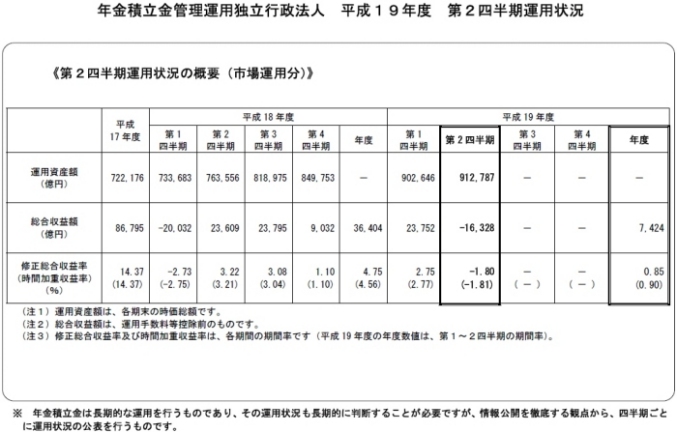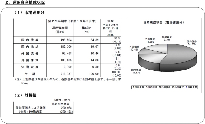 ところがそんな馬鹿なことを言っていると、2007年7−9月期の運用実績が出た。上の表がそれだ。運用利回り1.8%マイナス、1兆6328億円損失発生、9月末時点の総資産額は91兆2787億円と報道されていた。この程度の下落で運用利回りマイナスとなると、どこで買って、どこで売っているのか分からない。証券会社か、保険会社で、実務をこなしてから運用してほしいと思う。さすが、税金の無駄遣い、独立行政法人の考えていることは、庶民とは違う。運用資金はまた入ってくると考えているのだろう。給料はマイナス運用でももらえる。