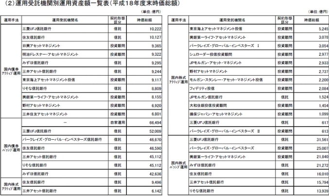 上の表は管理運用法人の国内債権、国内株式の受託機関の一覧表だ。ほとんどが信託と投資顧問。自家運用は、6兆6494億円だけだ。